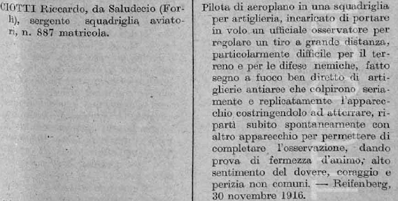 Questa premessa è d'obbligo per introdurre la figura di Riccardo Ciotti (Saludecio, 19 giugno 1895 - Ospedaletto da Campo 245, 23 aprile 1917), Sergente saludecese dell'Ottantunesima Squadriglia Aeroplani; autentico Asso dell'Aria, insignito delle Medaglie d'Argento e Bronzo al Valor Militare e spirato, eroicamente, dopo aver riportato ferite in combattimento.